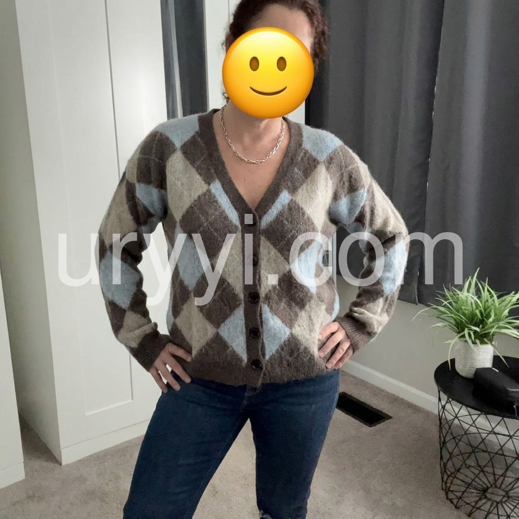 This cardigan features a timeless argyle geometric print in versatile neutral tones, offering a sophisticated layering option. Crafted with a button-front design, it allows easy wear and adjustable styling. Its refined pattern blends classic and contemporary elements, making it an ideal choice for enhancing both casual and polished outfits with subtle texture and depth.