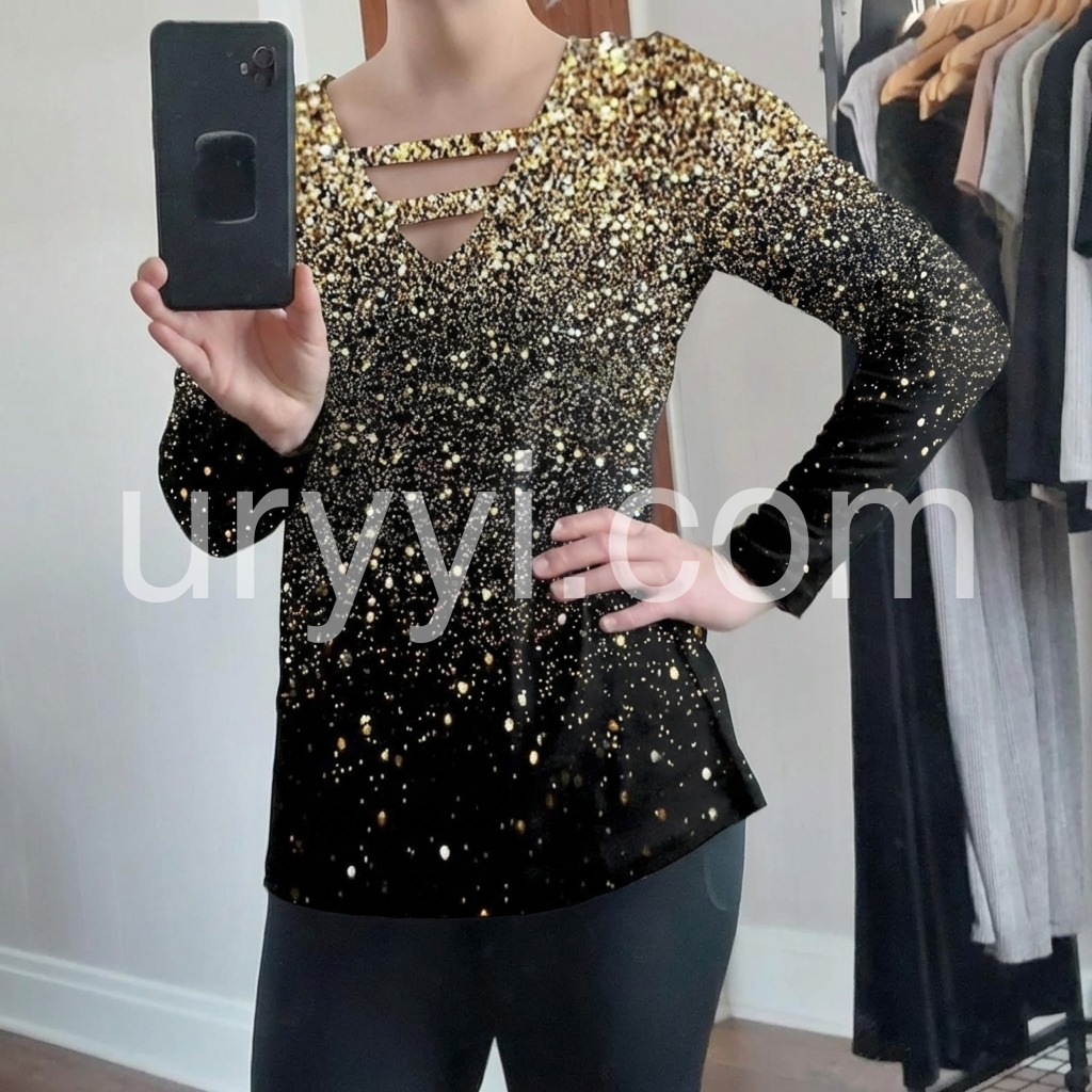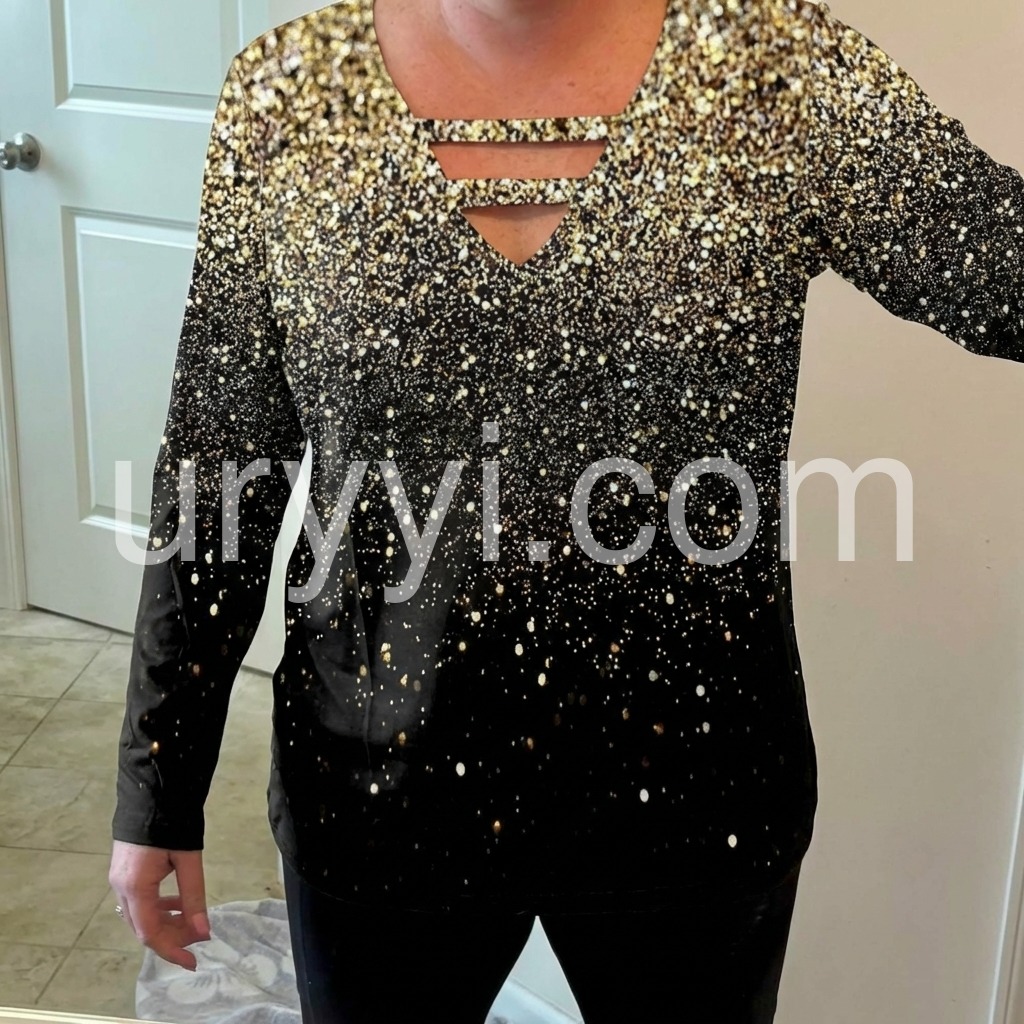 Just in time for your next glam holiday vacay! This sultry, strappy caged shirt has a v-neckline that awaits your favorite layering necklaces or statement jewels. This unique long-sleeved top sparkles with a generous sprinkle of metallic ombre silver and gold print, perfect for pairing with jeans or black slacks, boots, and metallic heels. Machine wash cold tumble dry low to medium heat. Iron if needed or lay flat to dry.