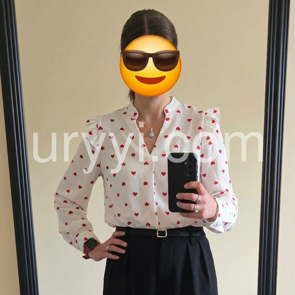 Take this lightweight red heart blouse anywhere with its fitted leg o’ mutton long sleeves with flared ruffles on the shoulders. The plunging fold-over v-neckline and fitted silhouette can be paired with high-waisted denim, slacks, or shorts. Finish your look with casual sneakers, sandals, and so much more. Wash in gentle or delicate cycle with light colors. Keep away from dark colors. The delicate fabric may absorb dark colors.