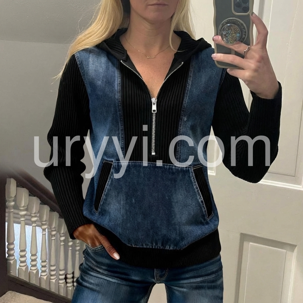 Cool Half Zip Kangaroo Pocket Denim Sweatshirt