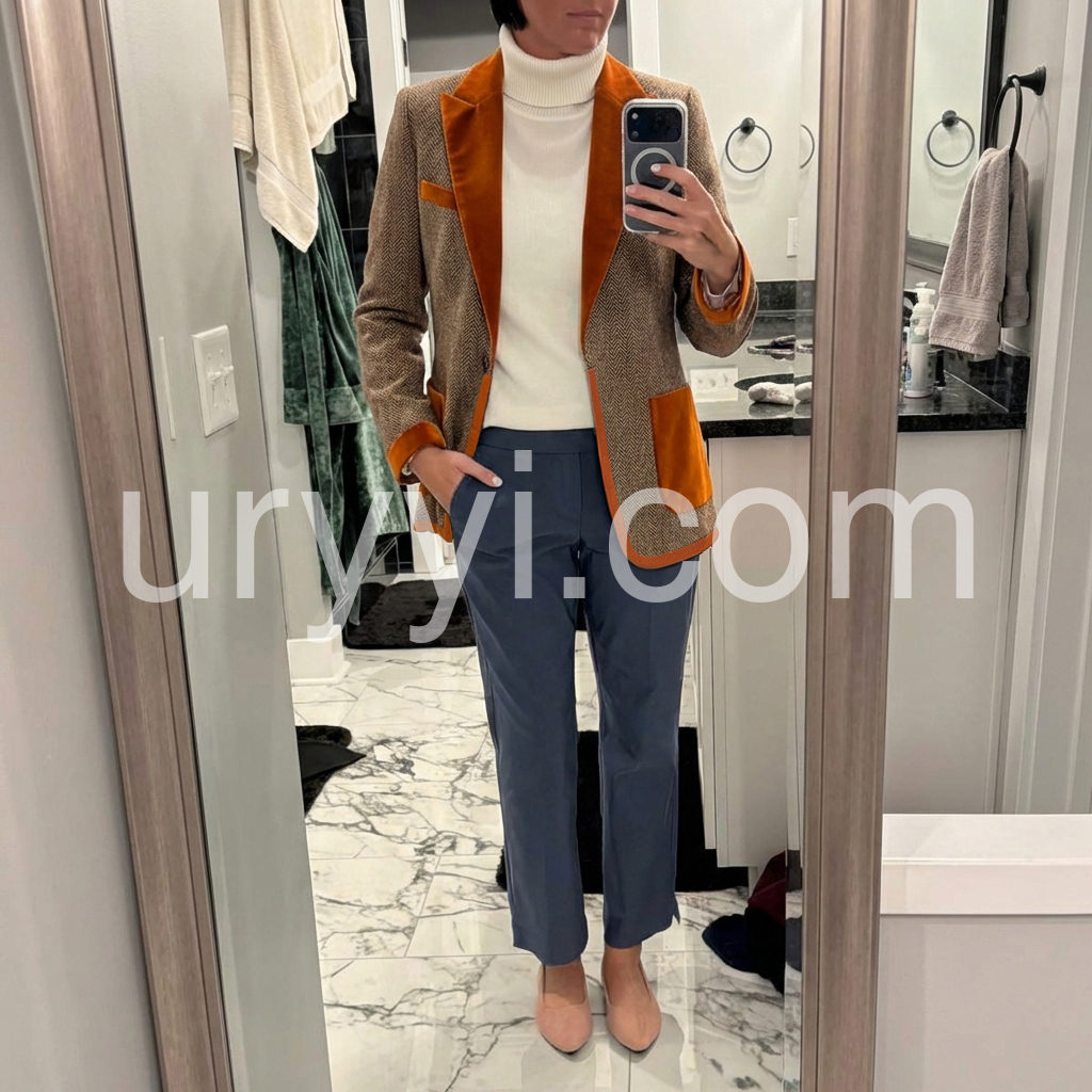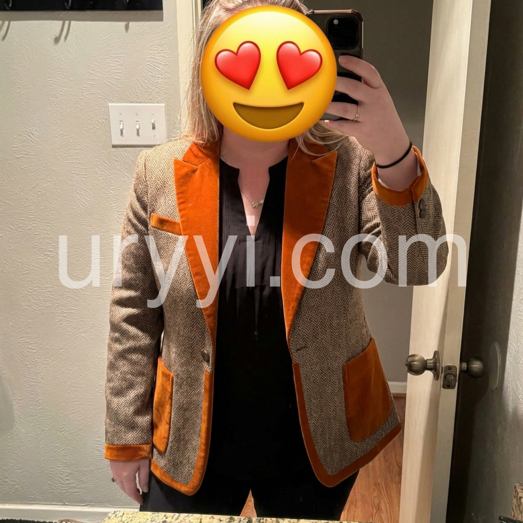 Elevate your wardrobe with this sophisticated brown herringbone velvet blazer, a timeless piece that seamlessly bridges vintage charm and contemporary style. The luxurious velvet fabric showcases a classic herringbone weave, delivering both visual depth and tactile elegance. Featuring a refined single-button closure, this blazer offers a streamlined silhouette that flatters various body types while maintaining impeccable structure. The rich brown tone pairs effortlessly with neutrals or bold accents, making it an indispensable layering piece for professional settings, evening occasions, or elevated casual wear. Perfect for those who appreciate quality craftsmanship and enduring design.