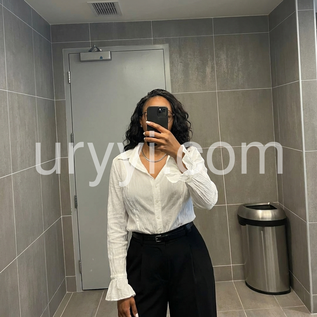 This white plain button-down shirt features a deep V-neck design and flared cuffs for a sophisticated silhouette. Crafted with clean lines and minimal detailing, it offers a versatile, polished look ideal for both professional settings and elegant casual wear. The flared cuffs add a subtle statement, elevating the classic button-down style.